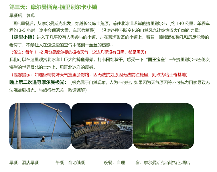 1、住宿:当地4晚当地四星酒店+3晚摩尔曼当地特色酒店(1、散拼团队安排同性别客人入住同一间房,不能保证