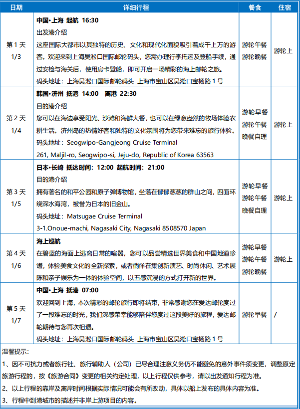 1、因不可抗力或者旅行社、旅行辅助人(公司)已尽合理注意义务仍不能避免的意外事件须变更,调整原定 旅游行程的,按《旅游合同》变更的相关约定处理,以上行程仅供参考,请以出发通知行程为准。 2、以上行程的靠岸及离岸时间根据实际情况可能会有所改动,具体以船上发布的具体内容为准。 3、行程中到港城市的描述并非岸上游项目的内容。4、以上时间均为当地时间。 5,、经停港码头地址仅供参考,须以邮轮实际运营时停靠地址为准。您可在停靠当天邮轮日报上获取详细信息