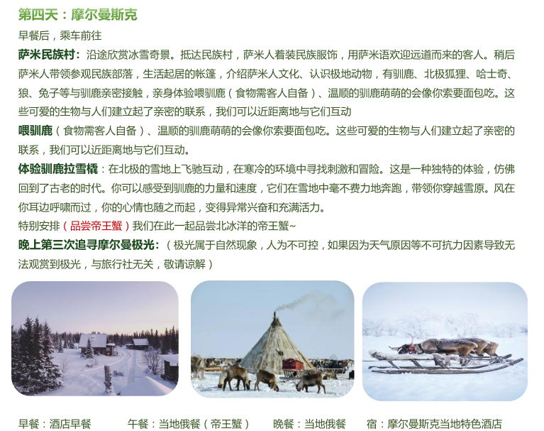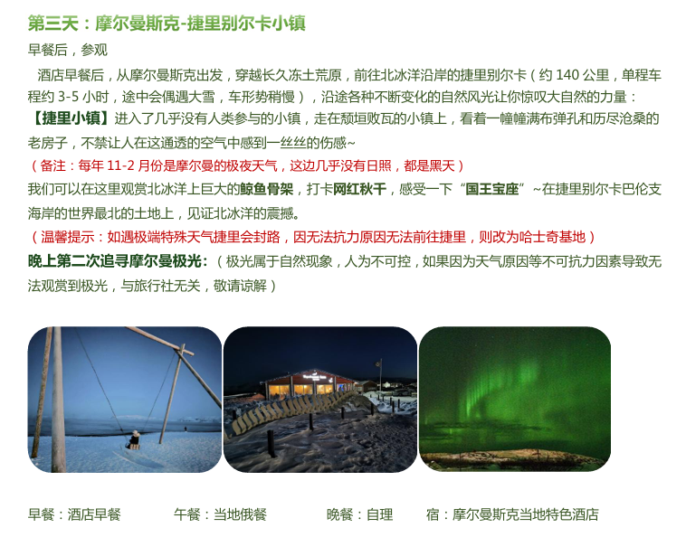 1、住宿:当地4晚当地四星酒店+3晚摩尔曼当地特色酒店(1、散拼团队安排同性别客人入住同一间房,不能保证