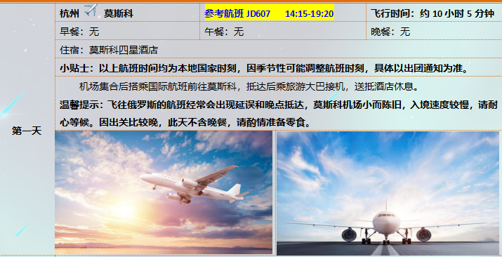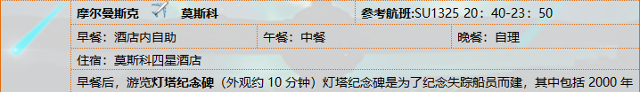 1、机票:杭州/莫斯科往返国际机票,团队经济舱,含机场建设税,含行李额,圣彼得堡/摩尔曼斯克、摩尔曼斯克/莫斯科机票,含机场建设税,含行李额;