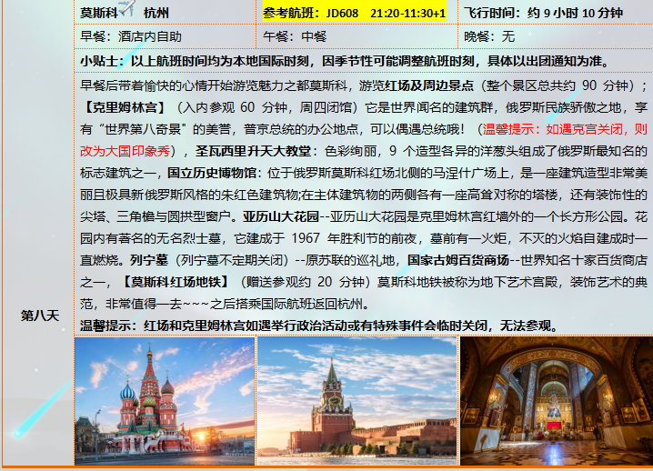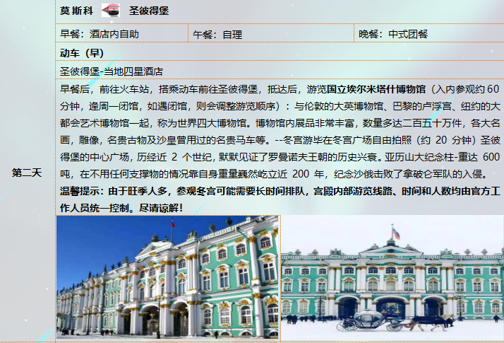 4、用餐地点:莫斯科和圣彼得堡交通经常有堵车状况,因此餐厅安排以就近合理为原则!