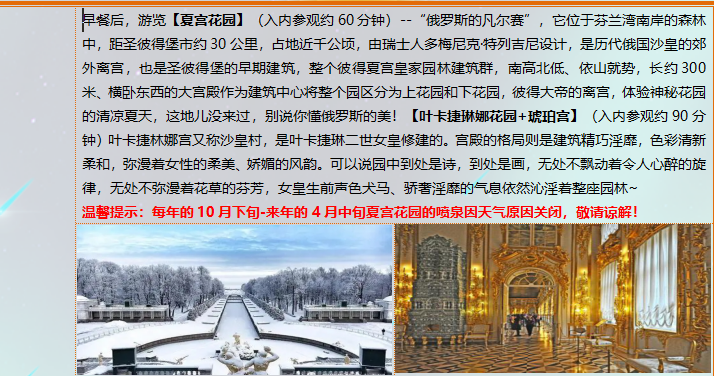 6、门票:行程中所列景点首道门票即:萨米村、冬宫、夏宫花园、叶卡捷琳娜花园和宫殿、克里姆林宫、莫斯科地铁;
