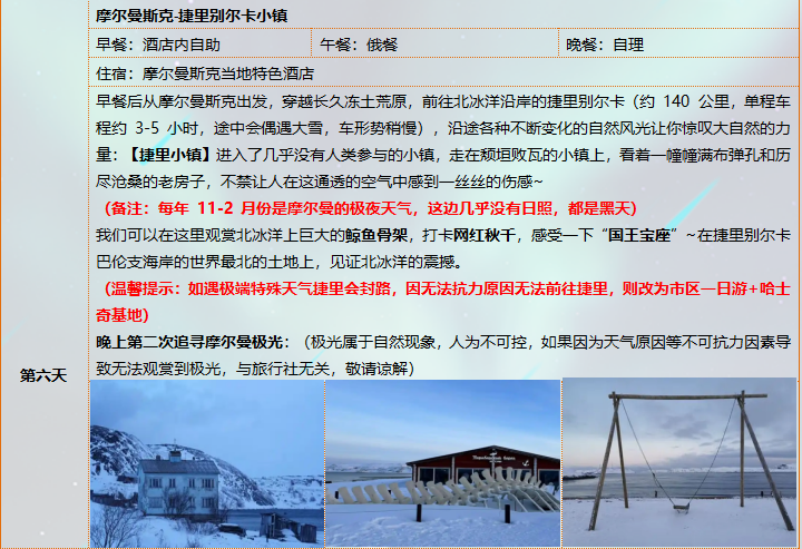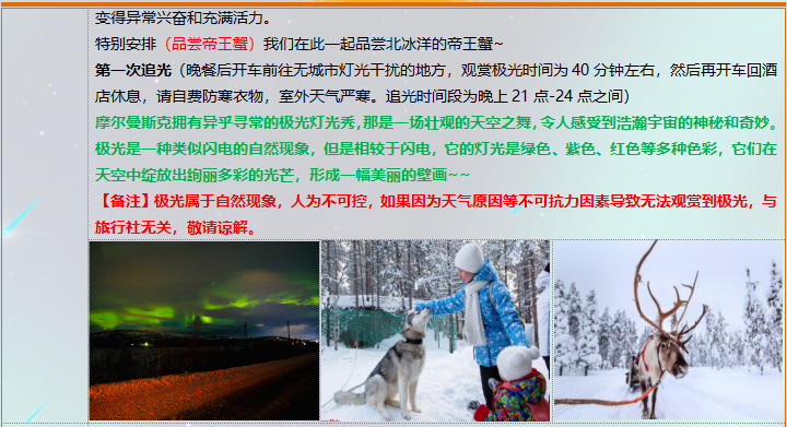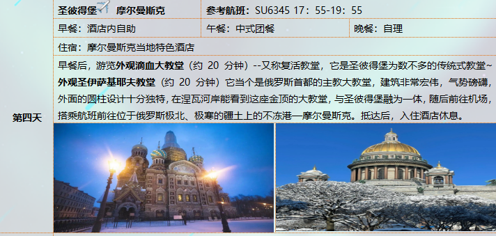 5、用餐:正餐:莫斯科圣彼得堡为中餐用餐(正餐八菜一汤,十人一桌。如一桌人数减少餐数量减少),十人一桌;摩尔曼斯克用餐为简式俄餐或当地特色餐。摩尔曼斯克品尝帝王蟹,特色俄餐;