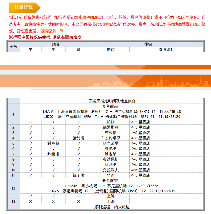 2.住宿:行程中参考酒店(欧洲酒店无官方星级评定,行程中所列酒店星级以 BOOKING 或携程评定为标准,如遇展会/旺季/当地节