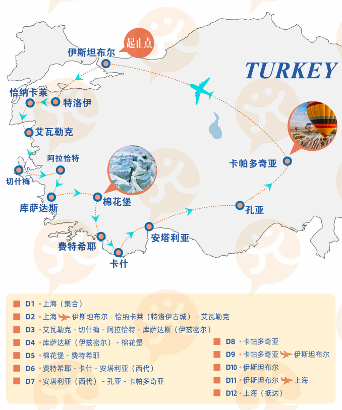 恰纳卡莱+阿拉恰特+切什梅+库萨达斯+棉花堡+费特希耶+公路D400+安塔利亚+卡帕多奇亚