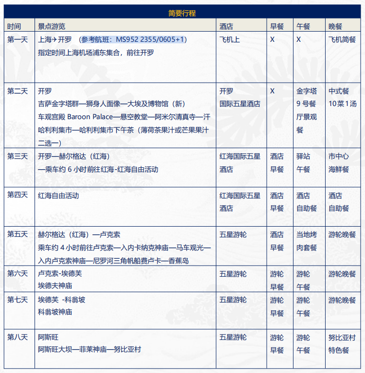 4. 用餐标准: 行程中所列餐食,午晚餐为中式团队餐(10-12 人一桌,餐标 10 菜一汤)或特色餐(以行程为准);
