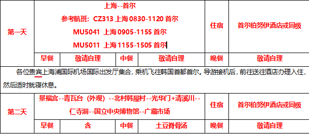 1、交通:上海往返首尔机票含税,当地旅游用车;