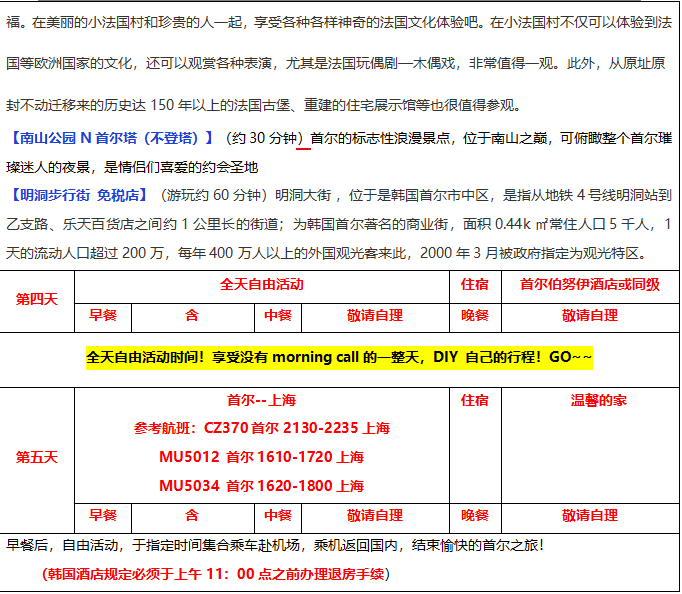 4、餐食:全程酒店含早,3正餐(正餐:参鸡汤料理、土豆脊骨汤、等韩国特色美食,所有餐食如自动放弃,餐费恕不退,餐食顺序按实际行程做相应调整;