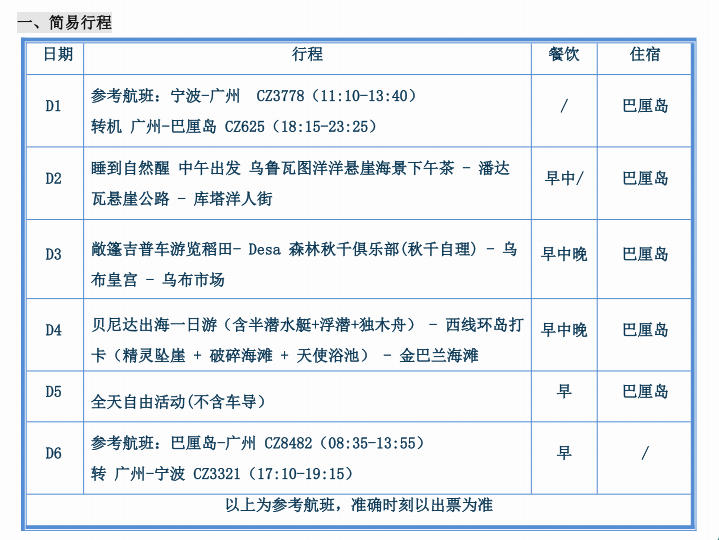 参考航班:宁波-广州CZ3778 (11:10-13:40)转机广州-巴厘岛 CZ625(18:15-23:25)